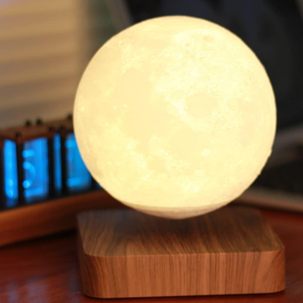 A definite conversation starter, this lamp showcases a detailed miniature moon that levitates and spins magnetically above its base. It emits a gentle, atmospheric light with multiple color settings, introducing a uniquely futuristic and artistic element to any room’s decor.